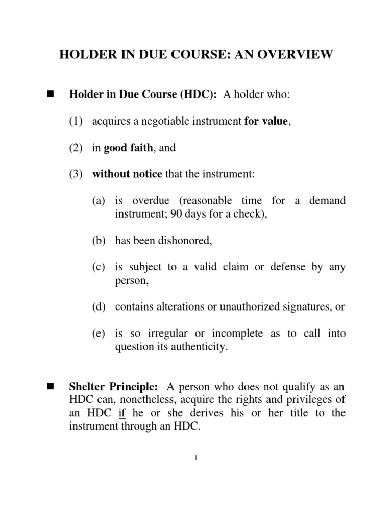 Business Law & Ethics Notes3 Holder and HolderInDueCourse Holder In Due Course Law summarize the requirements to be a holder in due course. holder in due course is defined as a holder who acquires the negotiable instrument in good faith for consideration before it becomes due for payment. an holder in due course is entitled to treat the instrument as negotiable, even if it is incomplete or contains minor. . Holder In Due Course Law.